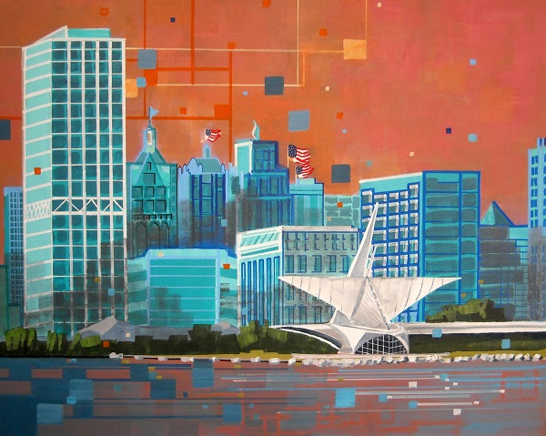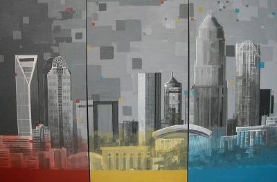 Some cities I painted in groups, especially in 2014 when I was doing a corporate commission of 27 American cities. I’d do 3 or 4 at a time in the same palette, like Phoenix, Denver and some SoCal metros. After I had been painting cities for a few years with good success, I developed some techniques, besides the obvious one of drawing the skyline. I’d paint all the major buildings in the same color, for example. And “sketch” in lesser blocks like watercolors.