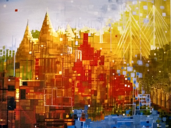 You didn’t see that in the end because I’d usually bring them closer to reality, well, my blocky-color-saturated-reality, anyway. But I often liked those unfinished cities, and if I had the time, I’d let them sit on the wall that way, and let them “simmer.” It’s a wonderful way to be able to paint, to have the time to let things hang unfinished until you get the spark that says, “that’s what needs to be there!” Or, “that’s how the light needs to come in.
