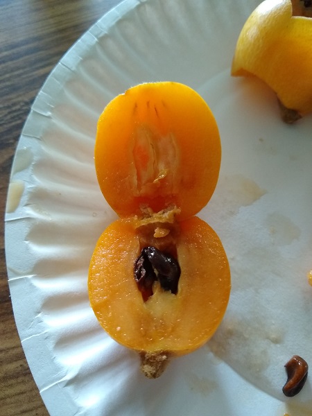 This spring, a neighborhood friend, a plant aficionado, told us they were loquats and that we could eat the fruit. I’d heard of loquats, but always figured they were like kumquats, which I’ve never cared for. But they’re not. They’re not even in the citrus family. They are in the apple family and sometimes called Japanese plums.