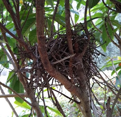Suffice it to say, we’re glad we didn’t chop them down. As are the birds who nest in them every year, cardinals and now something else, whose nest is remarkable all by itself!
